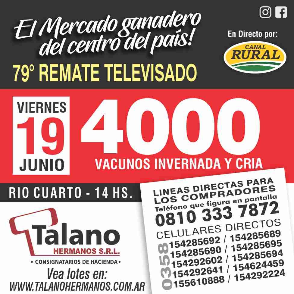 Talano Hnos realiza el próximo viernes 19 de Junio su 79° remate televisado del centro del país en directo por Canal Rural.