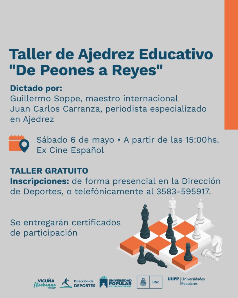 La Municipalidad de Vicuña Mackenna informó que ya se encuentran habilitadas las inscripciones para el Taller gratuito de Ajedrez Educativo, de Peones a Reyes, el cual comenzará el día 6 de Mayo, a partir de las 15 hs.