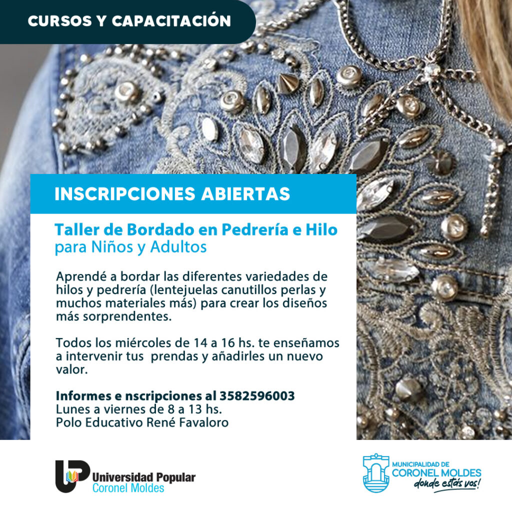 La Municipalidad de Coronel Moldes ya habilitó las inscripciones para el Taller de Bordado de Pedrería e Hilo a realizarse los días Miércoles de 14 a 16 hs, en el Polo Educativo René Favaloro.
