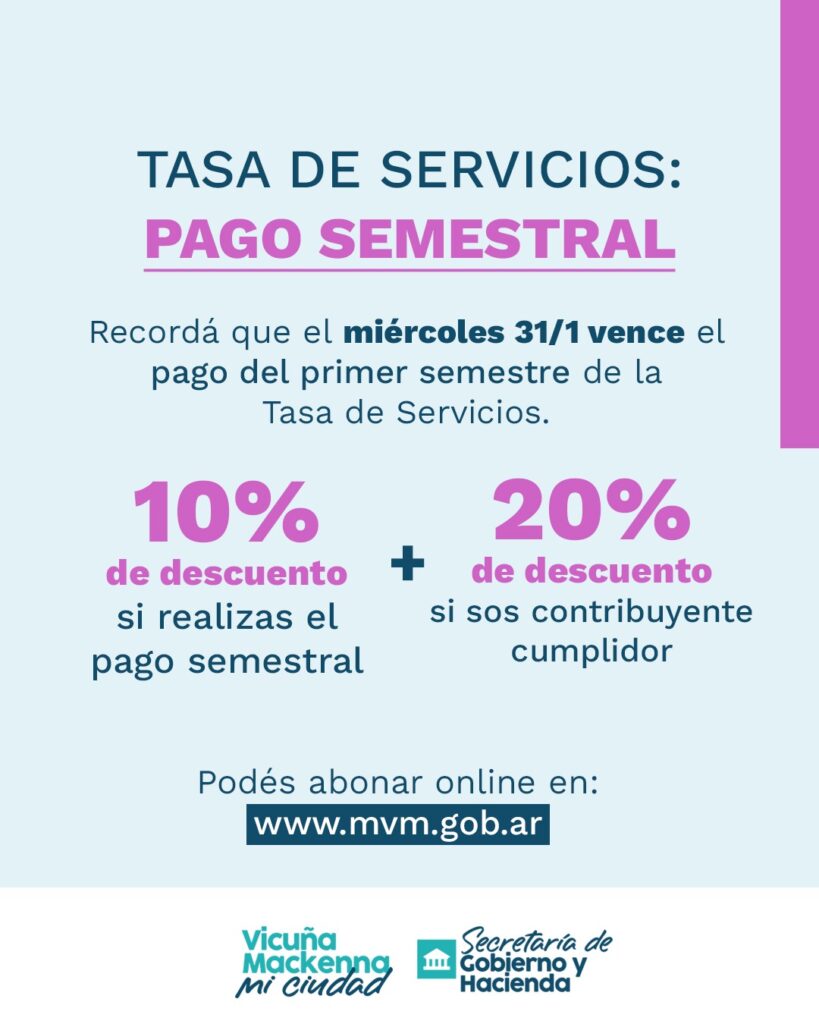 Le recordamos que el plazo para abonar el primer semestre de la Tasa de Servicios vence el Miércoles 31/1. Si realiza el pago semestral, podrá beneficiarse de un 10 % DE DESCUENTO sobre el monto total.