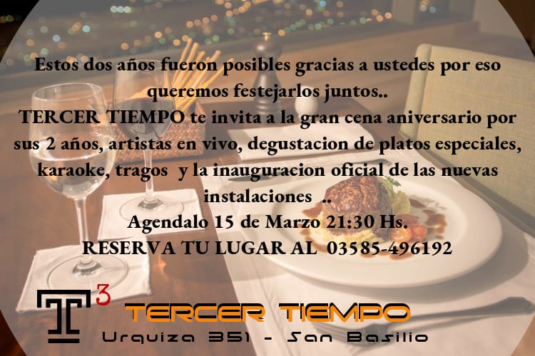 Tercer tiempo va en busca de su segundo Aniversario en San Basilio, y para ello planea una gran noche el día 15 de Marzo a las 21:30 horas. La gran velada contará con shows en vivo, Karaoke, de gustación de platos especiales y tragos, todo esto sumado a la gran Variedad de Pizzas y Empanadas de elaboración propia que será el plato fuerte de la noche..