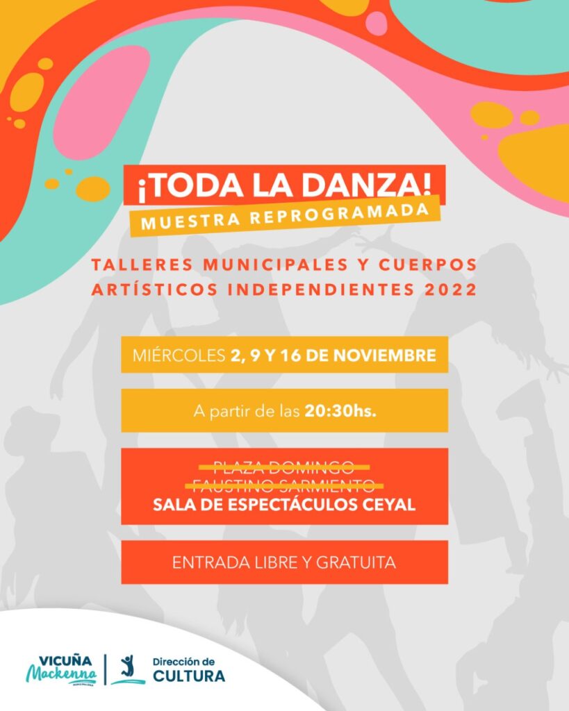 Se reprogramó para los días 2, 9 y 16 de Noviembre a las 20:30 hs en la Sala de Espectáculos Ceyal, de la localidad de Vicuña Mackenna, el evento programado «Toda la Danza».