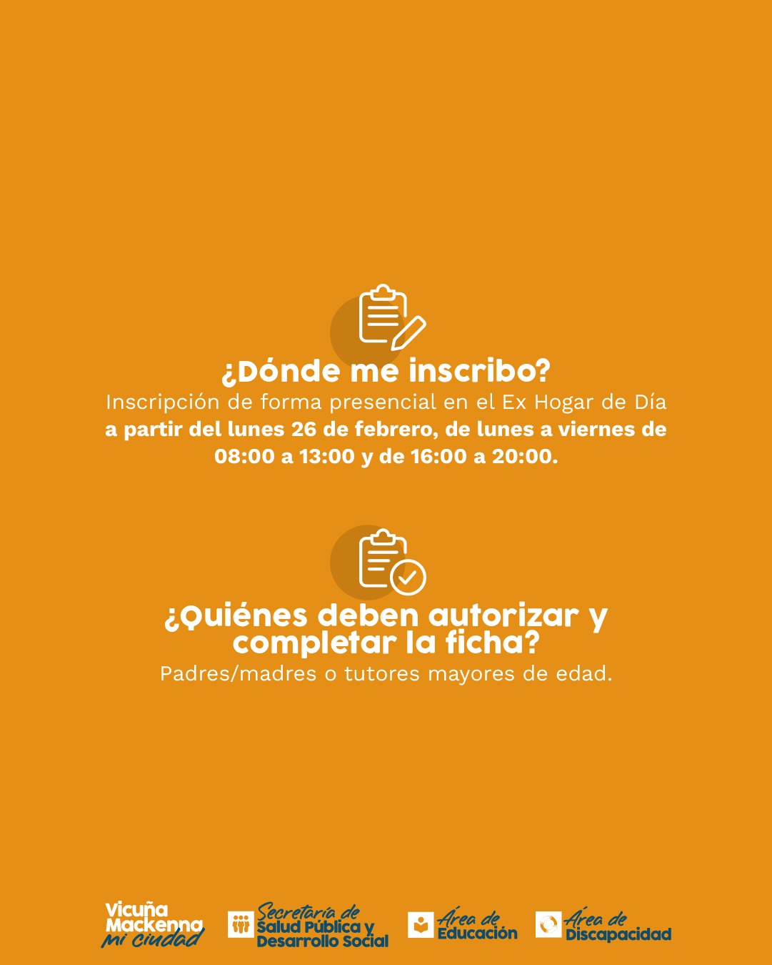 Inscripción de forma presencial en el Ex Hogar de Día a partir del lunes 26 de febrero, de lunes a viernes de 08:00 a 13:00 y de 16:00 a 20:00.