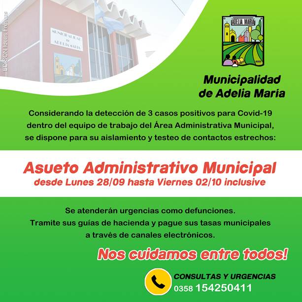 La Municipalidad de Adelia María decretó una semana de asueto administrativo debido a que se han registrado tres casos positivos de coronavirus de empleados de la institución.