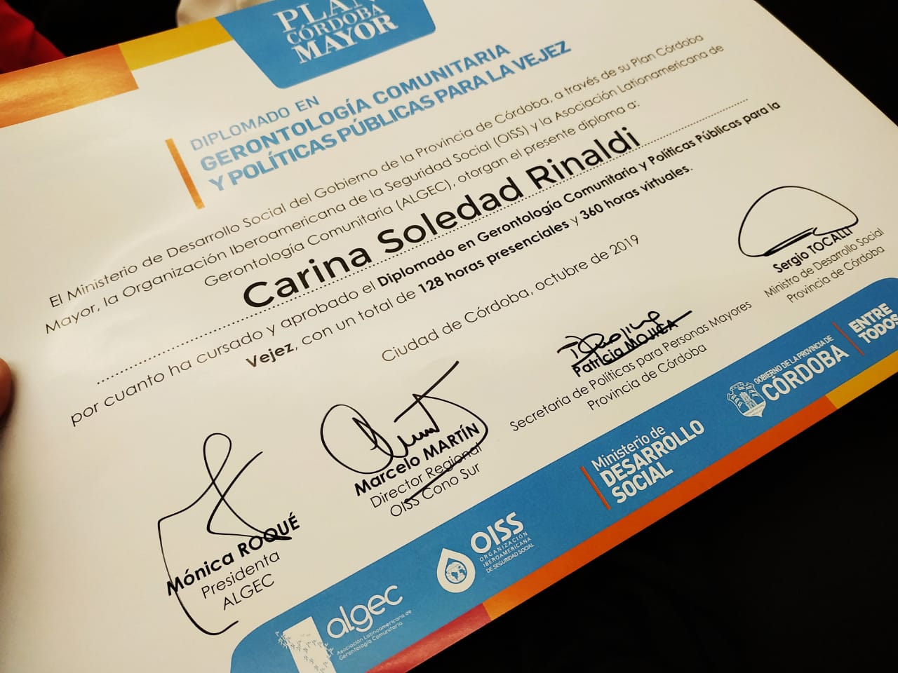 El pasado 26 de septiembre en la ciudad de Córdoba, se realizo la entrega de certificados a la Primera Promoción de la Diplomatura en Gerontologia Comunitaria y Políticas Públicas en la Vejez.
