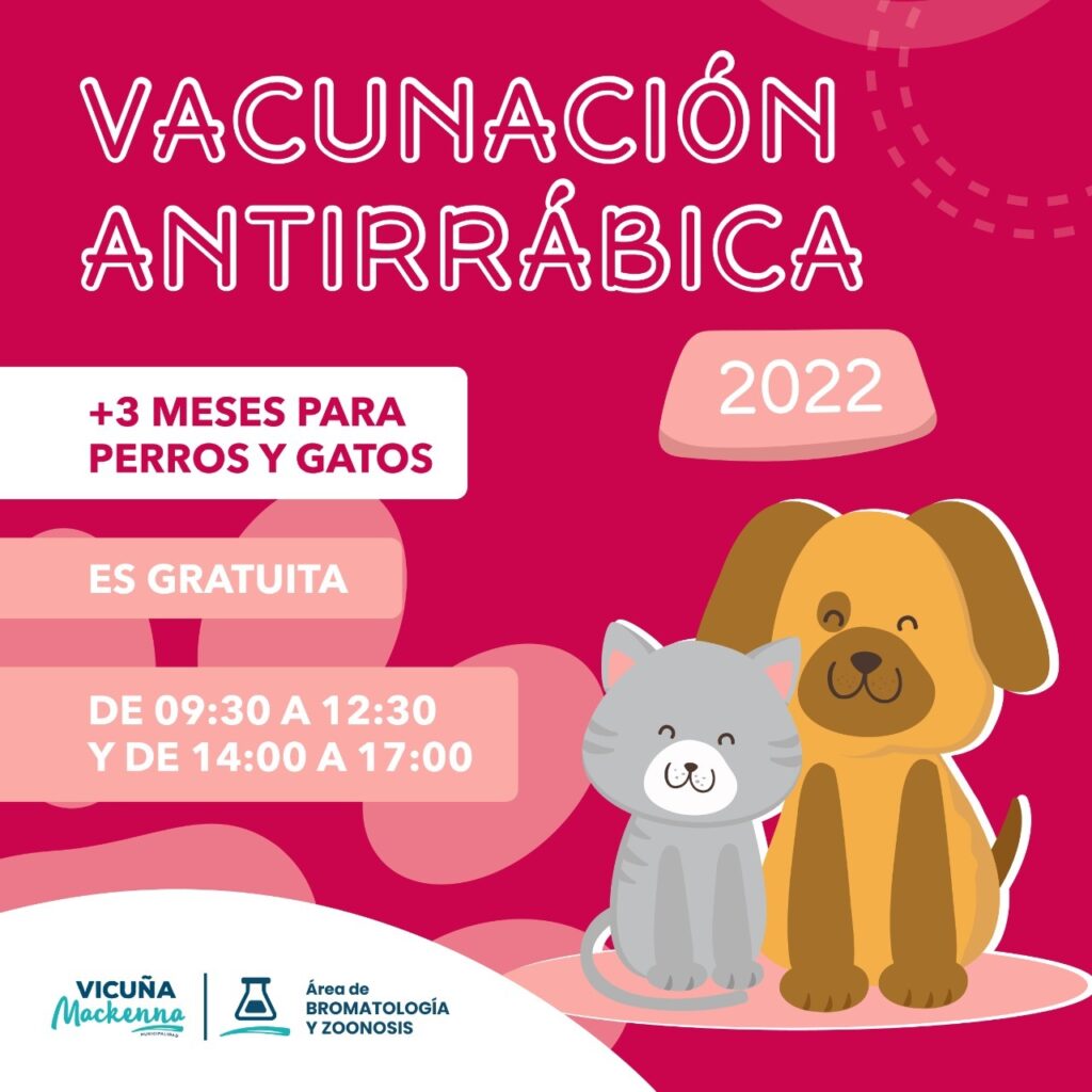 El Lunes 2 de Mayo, el Municipio de Vicuña Mackenna lanza la campaña de vacunación antirrábica para perros y gatos mayores de tres meses, la cual se llevará a cabo en la Sala Cuna/ Guardería Municipal, ubicada en la calle Pte. Perón (Servando Vidal esq. Alberto Novillo).