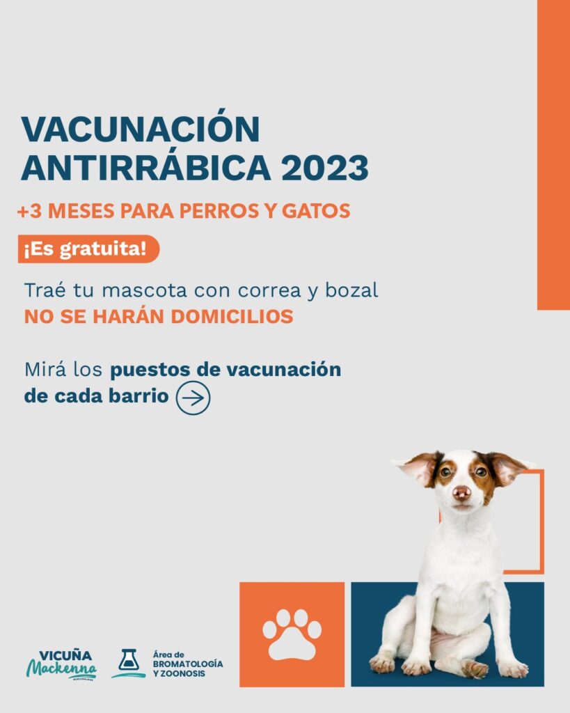 El Área de Bromatología y Zoonosis de la localidad de Vicuña Mackenna publicó los lugares, días y horarios en los que se podrá llevar a las mascotas a colocarles la vacuna antirrábica obligatoria en todo animal mayor a 3 meses.