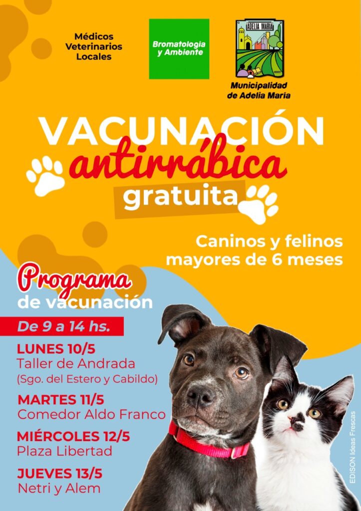 El Área de Bromatología de la Municipalidad de Adelia María, junto a Médicos Veterinarios locales, programa la Campaña de Vacunación Antirrábica destinada a caninos y felinos mayores de 6 meses.