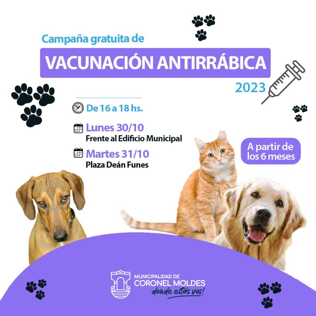 La semana que viene se llevará a cabo la Campaña de Vacunación Antirrábica 2023, organizada por la Municipalidad de Coronel Moldes.