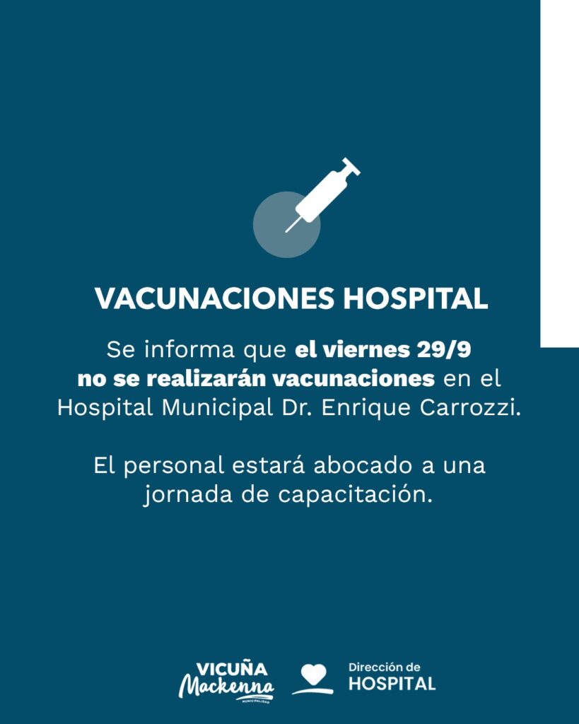 El Hospital Municipal de Vicuña Mackenna, Dr. Enrique Carrozzi comunica que el día Viernes 29/9 se suspenderá el servicio de vacunación por motivos de capacitación del personal.