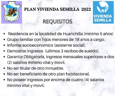 Desde el próximo lunes 7 de marzo, se encontrarán disponibles las planillas para la inscripción del programa Vivienda Semillas en la municipalidad de Huanchilla.