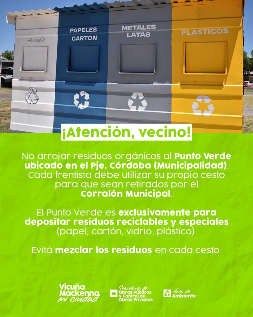 No arrojar residuos orgánicos al Punto Verde ubicado en el Pje. Córdoba (Municipalidad). Cada frentista debe utilizar su propio cesto para que sean retirados por el Corralón Municipal.