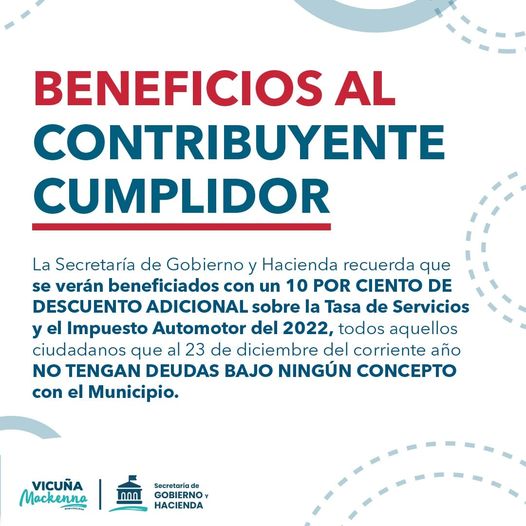La Municipalidad de Vicuña Mackenna recuerda que los contribuyentes cumplidores se verán beneficiados con un 10% de descuento adicional sobre la Tasa de Servicios y el Impuesto Automotor del 2022.