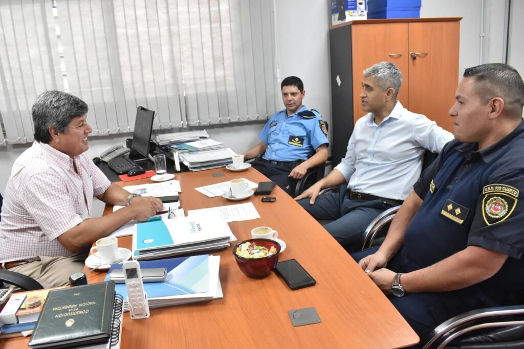 El Intendente Roberto Casari mantuvo una reunión en la Municipalidad con autoridades de la Unidad Departamental Río Cuarto de la Policía de Córdoba. Recibió a su Director, Comisario Mayor Agustín Torres; al Jefe de Zona – Comisario Inspector N°2 Hugo Ríos; y al Jefe de la Comisaría de Vicuña Mackenna, Tec. Seg. Comisario Alfredo García.