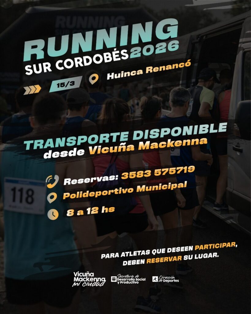 La Municipalidad de Vicuña Mackenna, a través de la Dirección de Deportes, informa que se pondrá a disposición una tráfic municipal para los atletas de la ciudad que deseen participar en la primera fecha del Campeonato Running del Sur de Córdoba, que se disputará el domingo 15 de marzo en Huinca Renancó.