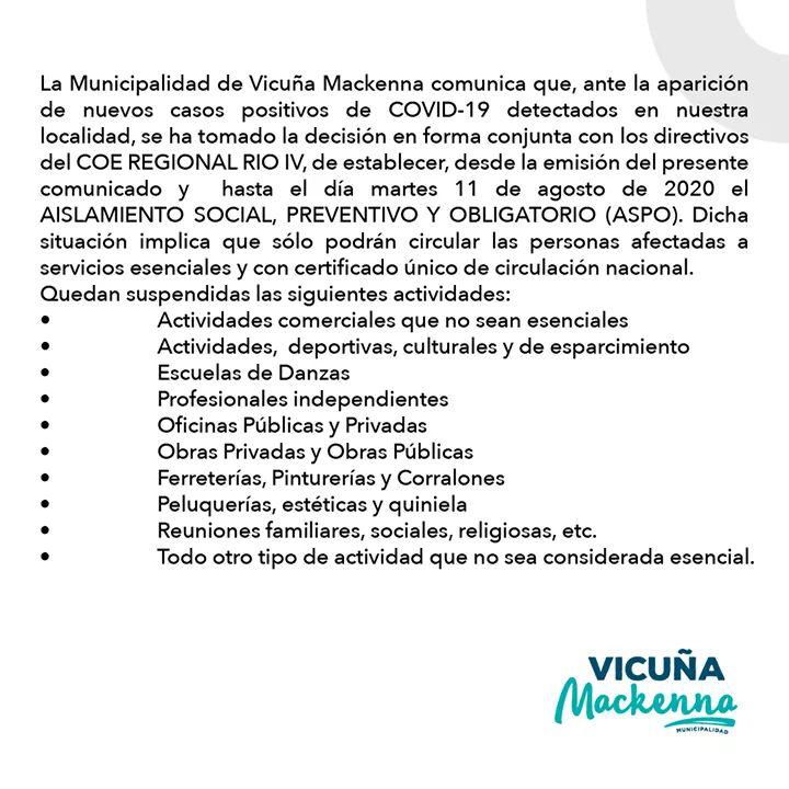 Ante la aparición de tres casos positivos de Covid-19 en las últimas horas, uno de ellos fallecido, desde la Municipalidad de Vicuña Mackenna adoptaron medidas tendientes a controlar la situación hasta tanto se determine el origen de los contagios.