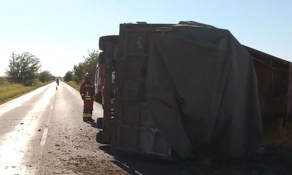 En Ruta Provincial E 24 Km 25, a la altura de San Basilio, por causas a establecer se produjo el vuelco de un camión marca Mercedes Benz, con acoplado cargado con granos de soja.